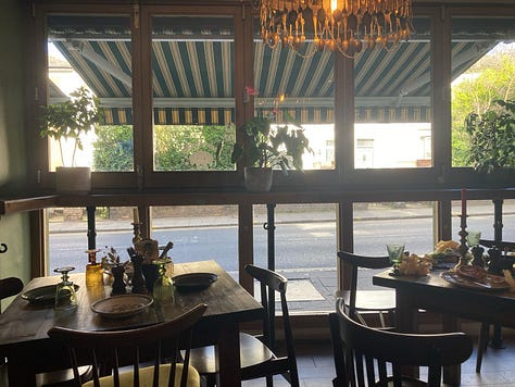 We entered an almost empty restaurant which, given it was 15.00, wasn’t the biggest surprise. But a vibe of relaxed indifference permeated throughout the room. A chilled out waitress leant against the till, a chef listened to music on his headphones, and a massive television screen at the back displayed exclusively kitsch AI landscapes whilst playing offensively loud and incoherent classical music.